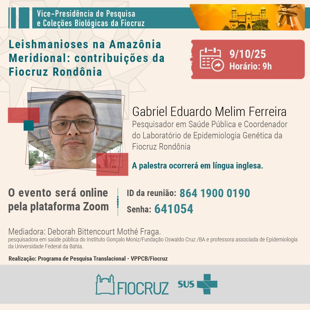 A Vice-Presidência de Pesquisa e Coleções Biológicas da Fiocruz convida para a palestra “Leishmanioses na Amazônia Meridional: contribuições da Fiocruz Rondônia”, que será ministrada por Gabriel Eduardo Melim Ferreira, pesquisador em Saúde Pública e coordenador do Laboratório de Epidemiologia Genética da Fiocruz Rondônia.