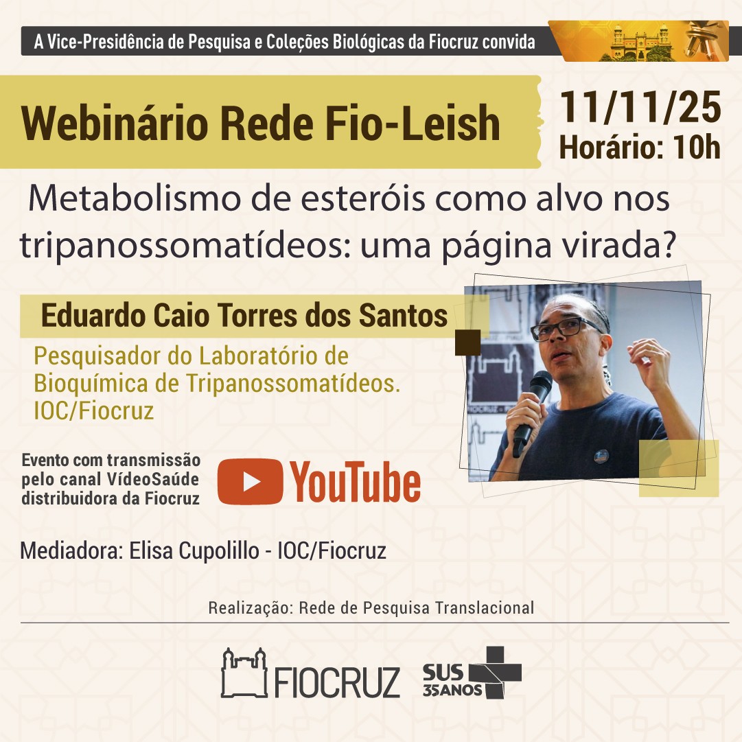 A Rede Fio-Leish, iniciativa vinculada à Vice-Presidência de Pesquisa e Coleções Biológicas (VPPCB) da Fiocruz, realiza na próxima terça-feira, 11 de novembro, às 10h, mais uma edição de seu ciclo de webinários. O tema desta vez será “Metabolismo de esteróis como alvo nos tripanossomatídeos: uma página virada?”, apresentado por Eduardo Caio Torres dos Santos, pesquisador do Laboratório de Bioquímica de Tripanossomatídeos do Instituto Oswaldo Cruz (IOC/Fiocruz).
